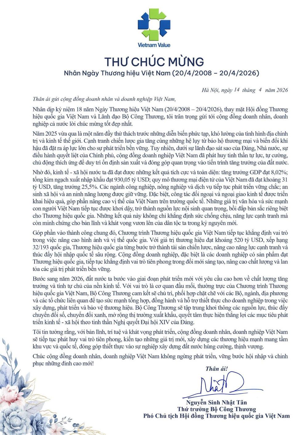 Thư chúc mừng của lãnh đạo Bộ Công Thương nhân Ngày Thương hiệu Việt Nam (20/4/2008 - 20/4/2026)